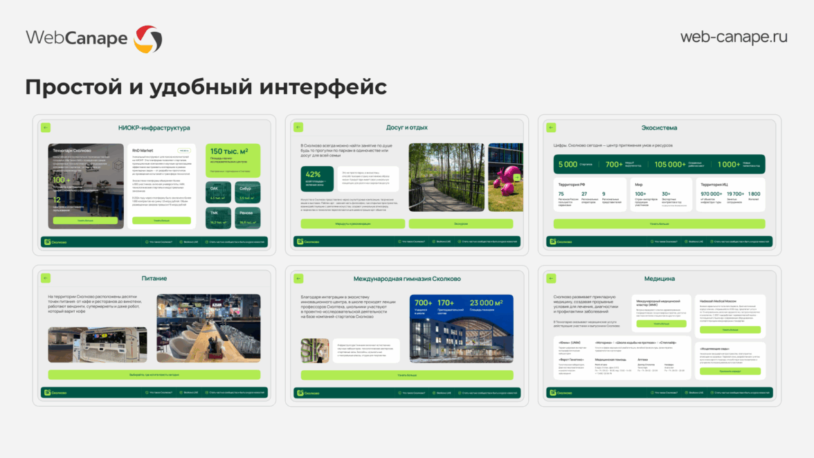 Тексты и структура разделов формировались уже в процессе. Это означало, что архитектура должна была быть гибкой: мы проектировали интерфейс в условиях, когда многие элементы уточнялись параллельно с разработкой.