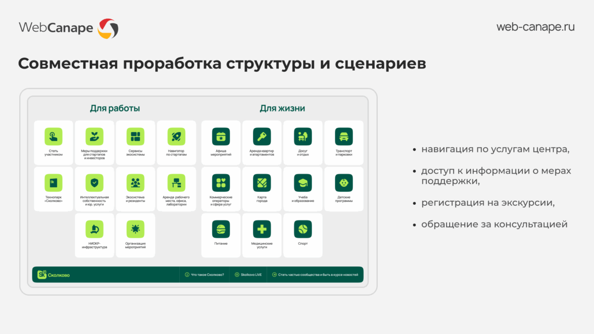 Технопарк «Сколково» выражает признательность компании WebCanape за разработку интерфейса информационной панели Единого Центра Услуг «Сколково».В сжатые сроки специалисты команды профессионально справились с нетривиальной задачей логического объединения разноплановых сервисов и превращения контента в понятный для конечного клиента продукт.