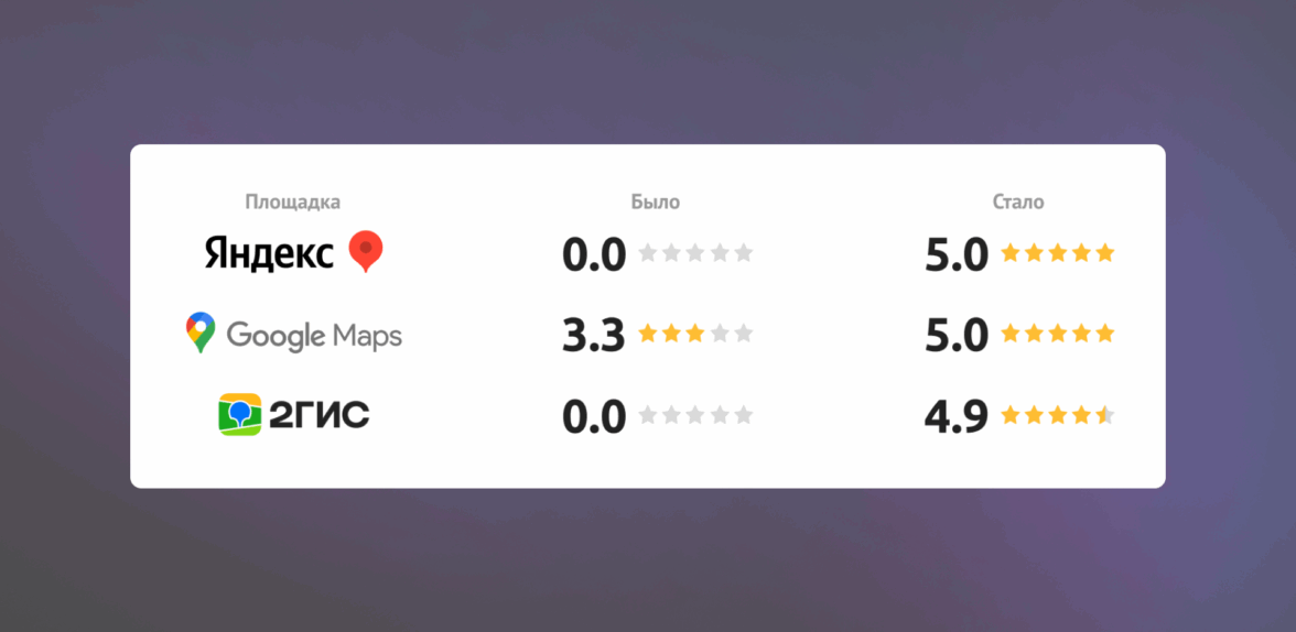 В результате всего за шесть месяцев ситуация изменилась кардинально. Средний рейтинг компании на ключевых площадках вырос до 4,9. В Яндекс.Картах показатель поднялся с нуля до 5.0, в Google Maps — с 3,3 до 5.0, в 2ГИС — с нуля до 4,9.