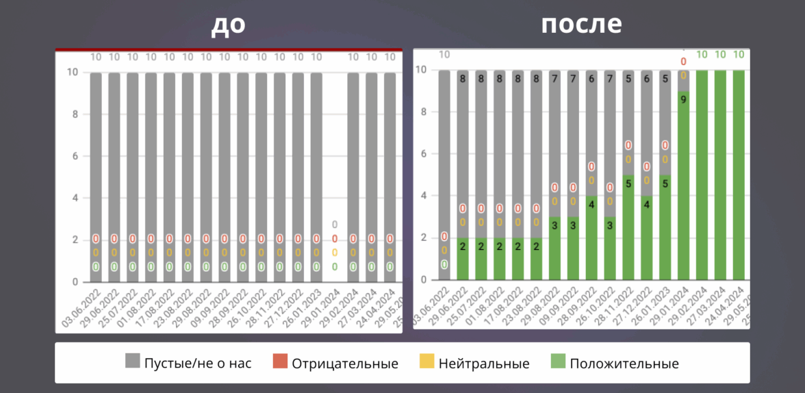 Отдельная работа велась с негативом. Как было сказано выше, за это время мы отработали шесть волн конкурентных атак с вбросом поддельных договоров и историй сотрудничества. В итоге удалось удалить около 70% отзывов, которые не имели отношения к реальной деятельности компании. Ещё 15% негативных откликов были нейтрализованы через официальные ответы и открытый диалог с клиентами. Остальные 15% мы вытеснили из топа поисковой выдачи по брендовым запросам.