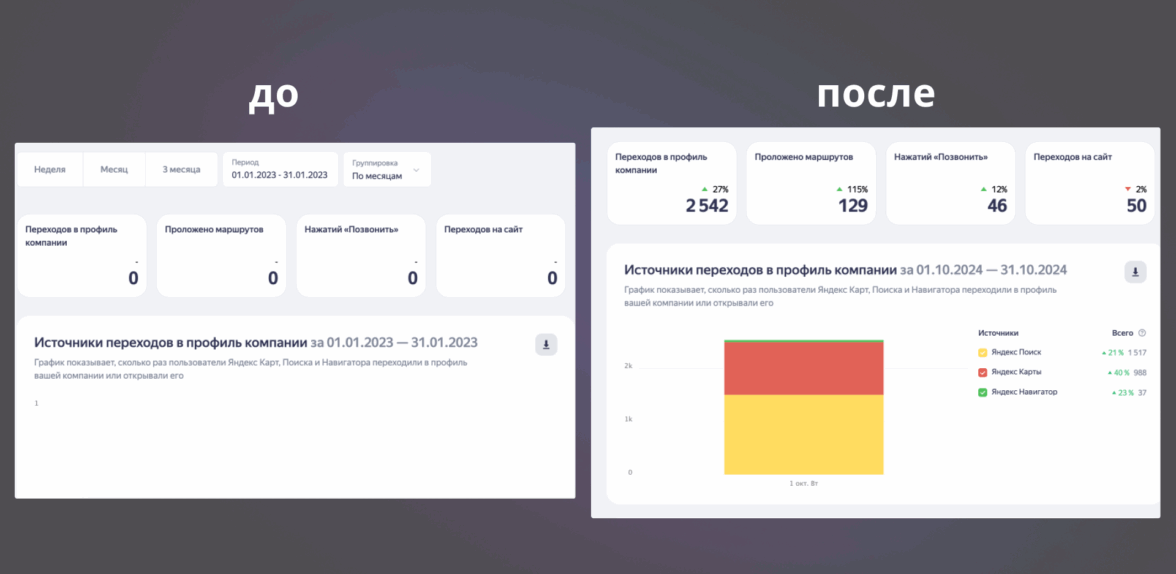 При этом клиент сознательно отказался от запуска рекламной кампании на Яндекс.Картах, поэтому мы сделали упор на грамотную оптимизацию карточек в рамках стандартного функционала. Как показала практика, этого было достаточно, чтобы добиться сильных результатов.