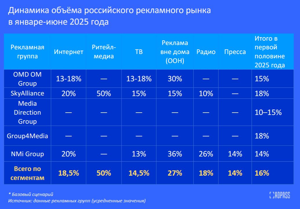 В январе-июне 2025 года объем российского рекламного рынка увеличился на 16%, посчитал ADPASS на основе данных девяти крупнейших рекламных групп. Такой показатель превышает темпы роста рекламной отрасли, которые зафиксировала АКАР в январе-марте этого года: рост 11% при объеме рынка в 185-187 млрд рублей. Правда, эта цифра не включает рекламу вне дома в первом квартале: в этом году АКАР не опубликовала данные по сегменту, сославшись на то, что эксперты разошлись в оценках.