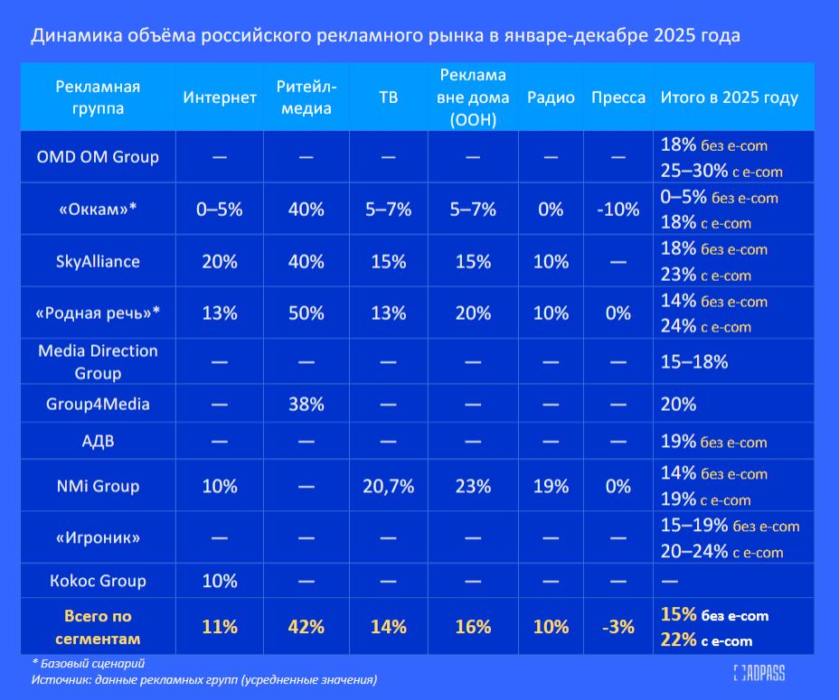 Группа «Оккам» в марте 2025 года представила два прогноза развития российского рекламного рынка: «очень даже» и «так себе». По оптимистичному сценарию рынок в 2025 году вырастет на 18–20% в традиционных каналах и на 38% с учетом рекламы в ритейл-медиа. В альтернативном варианте группа предполагала рост только на 18% с учетом ритейл-медиа и на 0-5% без них. «Сейчас мы видим предпосылки к тому, что второй сценарий становится основным», — сообщила ADPASS главный операционный директор «Оккам» Дарья Куркина.
