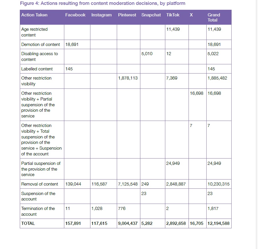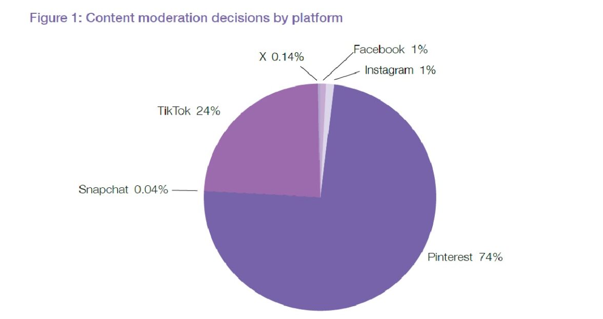 Высшая, или, скорее, исключительная мера наказания — закрытие аккаунта — использовалась редко, а в Snapchat и X — никогда. Всего за охваченный докладом период времени было закрыто 1817 аккаунтов, из них 1028 в Instagram, 776 в Pinterest, 11 в Facebook и 2 в TikTok.