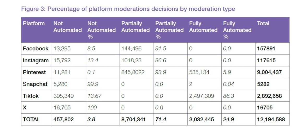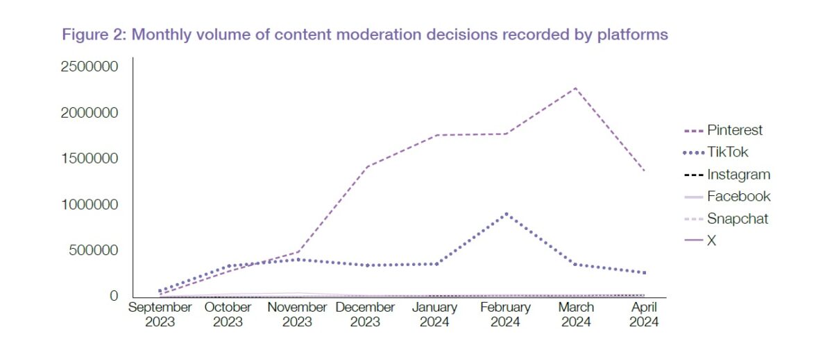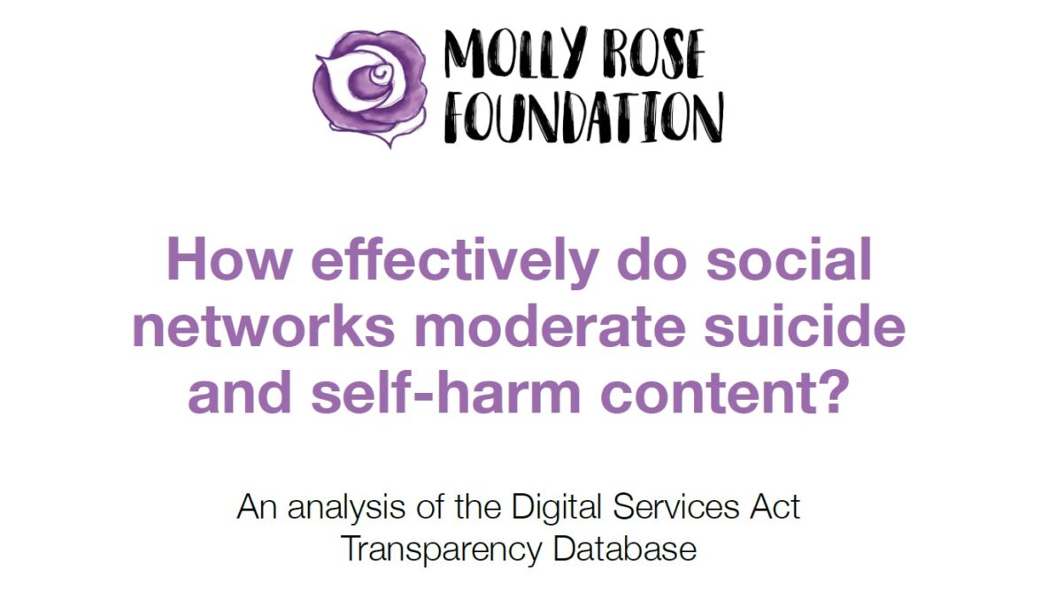 После вступления в силу в ЕС Закона о цифровых услугах (DSA) 26 сентября 2023 года крупнейшие онлайн-платформы стали обязаны публиковать информацию о всех решениях по модерации контента. Molly Rose Foundation проанализировал более 12 млн таких решений, принятых с сентября 2023 года по апрель 2024 года шестью ведущими технологическими платформами: Instagram, Facebook, TikTok, Pinterest, Snapchat и X. Из этого числа были выделены решения, в которых причиной для модерации в связи с нарушениями правил пользования платформой называлось «самоповреждение». В Законе о цифровых услугах этот термин толкуется в расширительном смысле — суицид, нанесение себе травм, нарушения пищевого поведения и другие способы причинения вреда своему телу.