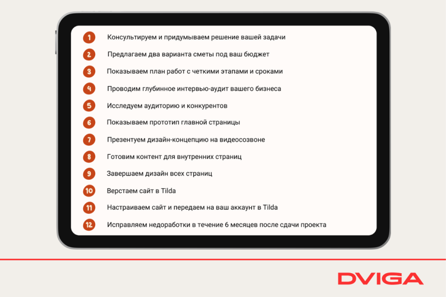 У нас процесс создания сайтов на Тильде состоит из 12 этапов. Выделю 4 самых основных, которые имеют непосредственное отношение к конечной стоимости проекта.