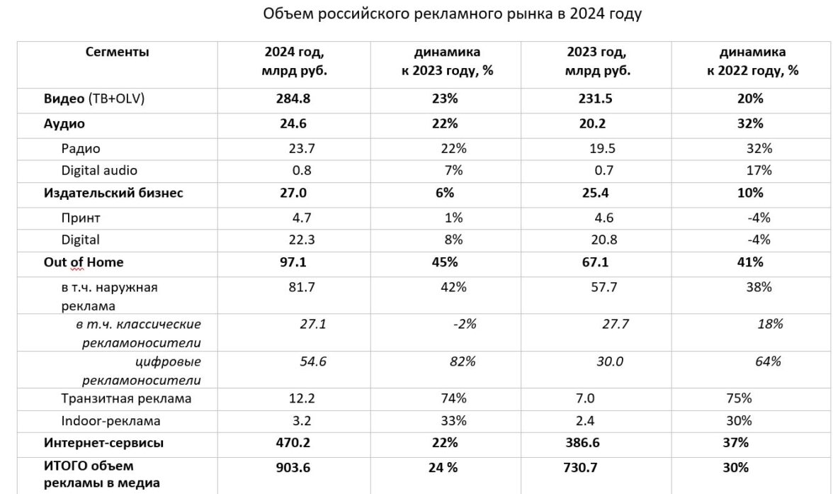 Хотя рекламодатели и считают видеоформат (OLV и ТВ) самым эффективным рекламным каналом, на деле в 2024 году на него они тратили не так много. По оценке АКАР объема российского рынка в 2024, году сегмент видео занял долю 31,5% от всех рекламных бюджетов. Большая же их часть (52%) пришлась на интернет-сервисы (поисковую рекламу и рекламу в соцсетях). По бюджетам цифровая реклама вне дома с долей в 6% опережала классическую наружную рекламу (3%), хотя по эффективности рекламодатели поставили их в обратном порядке. Самая низкая доля рекламных расходов пришлась не на рекламу в прессе, которая получила долю 3% в бюджетах за прошлый год, а на digital audio — на этот сегмент пришлось лишь 0,1% всех медиарасходов.