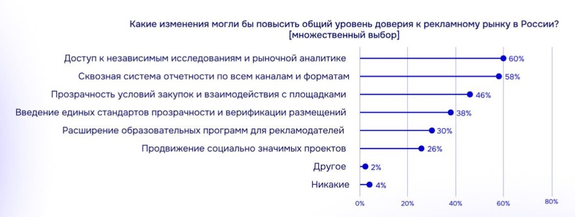 Изменить сложившуюся ситуацию и повысить доверие к рекламному рынку, по мнению 60% представителей брендов, поможет доступ к независимым исследованиям и рыночной аналитике. За сквозную систему отчетности по всем каналам и форматам высказались 58% опрошенных.