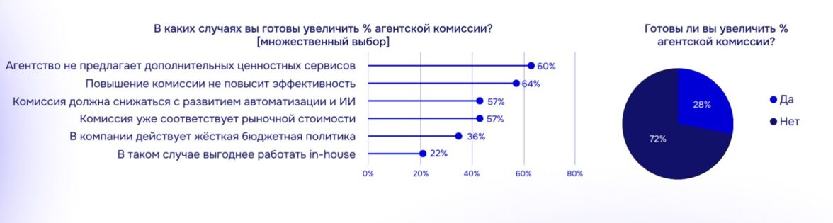 71% клиентов готовы увеличить комиссию агентства, если оно превысит плановые показатели, 64% — если дает бонусы по размещениям. Но проблема в том, что 72% рекламодателей не планируют увеличивать процент агентской комиссии в 2025 году. Основные причины: отсутствие у агентств дополнительных сервисов (64%) и сомнения в эффективности повышения комиссии как инструмента улучшения результатов (58%).