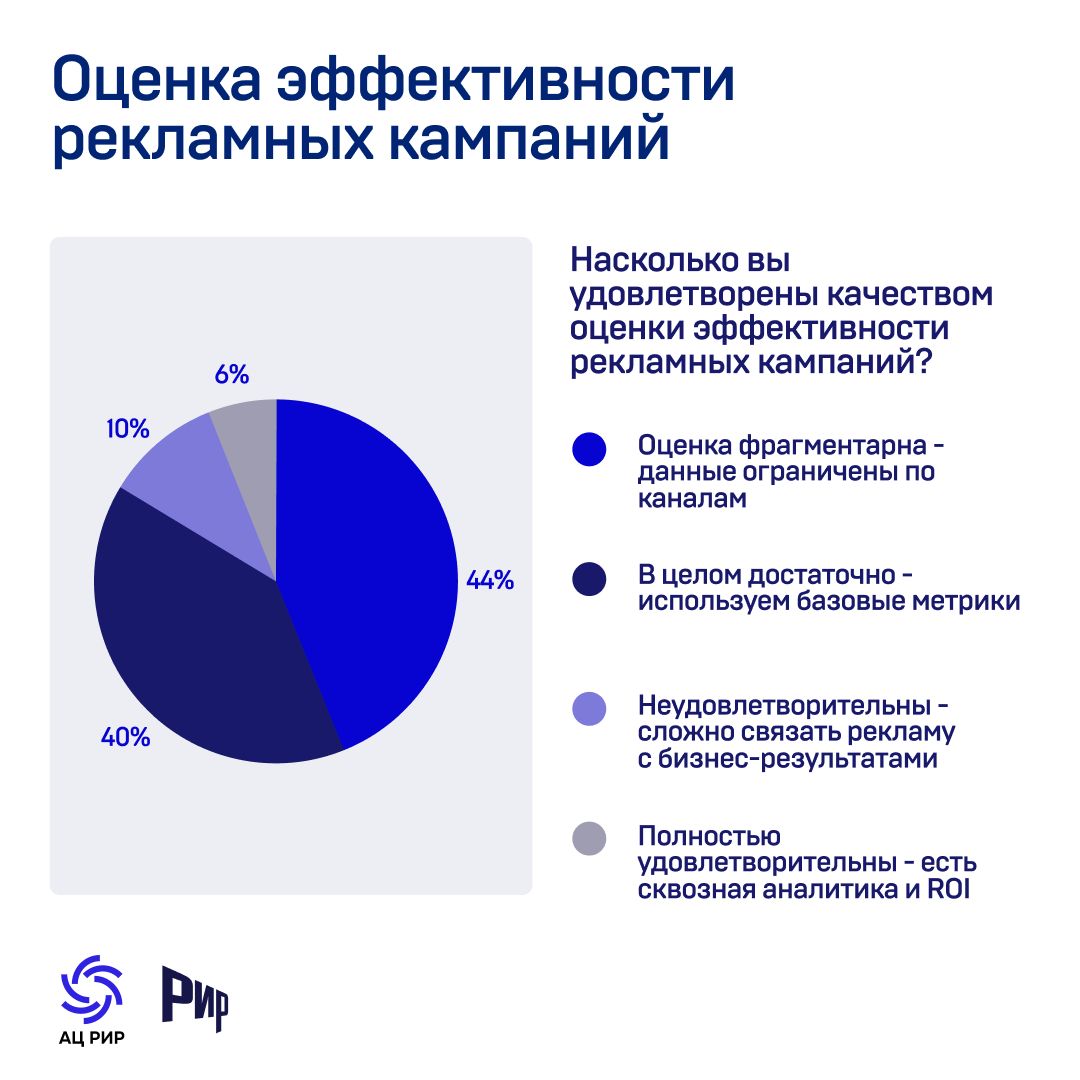 Для того, чтобы объективно оценивать эффективность рекламных кампаний в различных медиаканалах, существует аналитика, однако большая часть (54%) специалистов, опрошенных АКАР, заявили, что неудовлетворены или недостаточно удовлетворены качеством оценки рекламных кампаний. Полностью удовлетворенных аналитикой набралось всего 6%, тех, кого она удовлетворяет в «достаточной степени» — 40%.