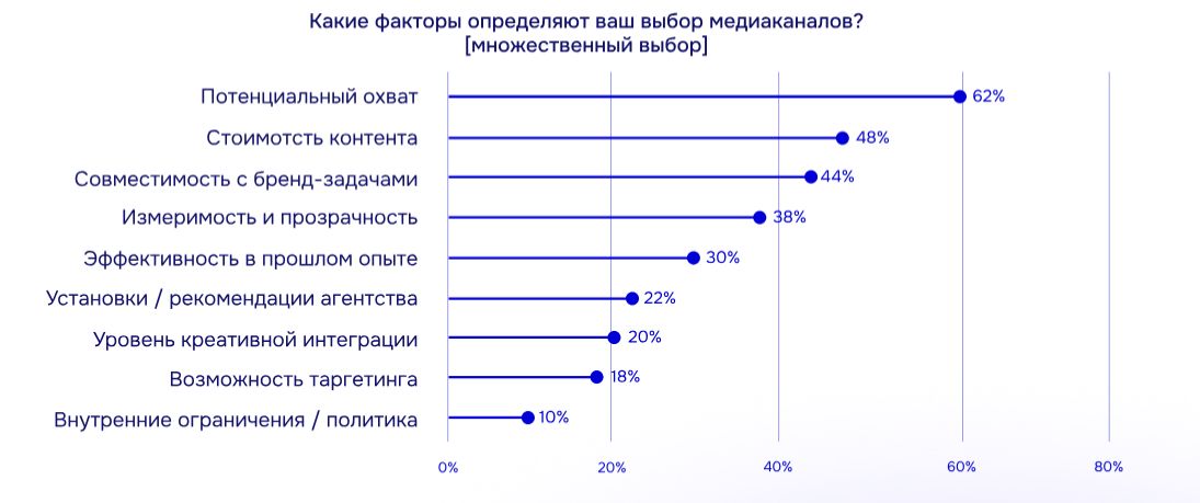 Основным критерием эффективности медиаканалов рекламодатели, опрошенные АКАР, называют потенциальный охват того или иного медиа — об этом сообщили 62% респондентов. На втором месте — стоимость (48%), на третьем — совместимость с бизнес-задачами (44%). Критерии с наименьшей важностью — политика компании (10%) и возможности таргетинга (18%).