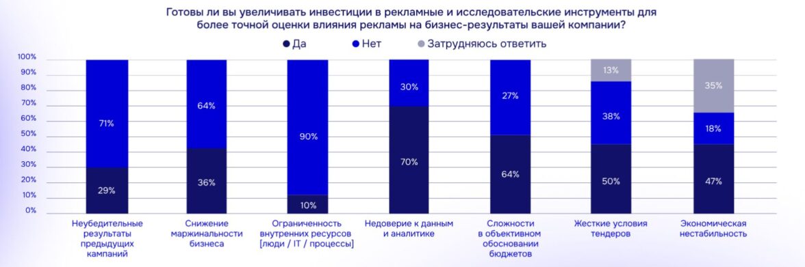 Наиболее расположены к увеличению инвестиций в исследовательские инструменты рекламодатели, которые не увеличивают рекламные бюджеты по причине недоверия к данным и аналитике — их 70%. На увеличение инвестиций в аналитику готов каждый второй рекламодатель, имеющий сложности в объективном обосновании рекламных бюджетов. Наименьшую готовность проявляют рекламодатели с ограниченными внутренними ресурсами (10%).