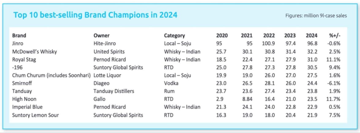 Несмотря на то что продажи южнокорейского соджу Jinro падают второй год подряд, этот бренд остается мировым лидером. Jinro — самый популярный алкоголь в мире. В 2024 году было продано 96,8 млн ящиков этого напитка. Хотя это на 0,6% меньше, чем в 2023 году, объемы продаж ближайших конкурентов в три-четыре раза ниже. Второе и третье место в рейтинге абсолютных продаж (во всех категориях спиртного) — у брендов индийского виски McDowell’s Whisky и Royal Stag — 32,2 млн ящиков (+2,5% к 2023 году) и 31 млн ящиков (+11,1%) соответственно. В Топ-10 по продажам вошли три бренда готовых к употреблению (ready to drink, RTD) алкогольных коктейлей: -196 (4-е место), High Noon (8-е) и Suntory Lemon Sour (10-е). Пятую строчку рейтинга абсолютных чемпионов занимает еще один бренд соджу — Chum Churum. На шестой позиции — водочный бренд Smirnoff от Diageo. Для него 2024 год выдался не очень удачным — падение продаж на 6,1%, при том что водочный сектор в целом сохранил продажи на уровне 2023 года. Седьмое место — у рома Tanduay. Девятое — у индийского виски Imperial Blue.