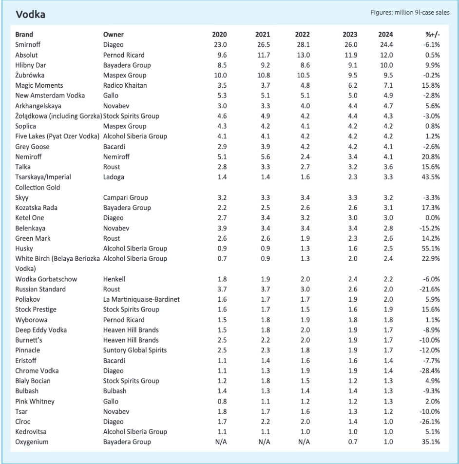 Самая продаваемая водка — Smirnoff компании Diageo (в 2024 году было продано 24,4 млн ящиков). Smirnoff возглавляет данный рейтинг не первый год. Второе место также стабильно удерживает водка Absolut компании Pernod Ricard. На третьем месте — водка «Хлебный дар» крупнейшего украинского производителя алкогольной продукции Bayadera Group (объединение бенефициаров Bayadera Group в России внесено в перечень организаций и физических лиц, причастных к экстремистской деятельности или терроризму, активы компании в России национализированы).