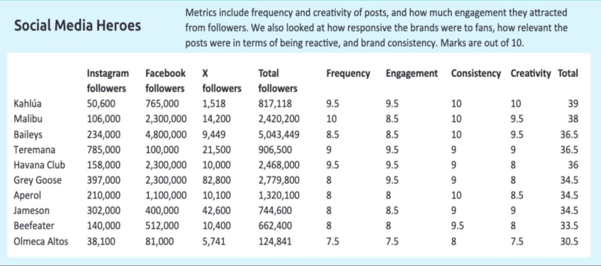 Главным героем соцсетей стал бренд ликера Kahlua, набравший 39 баллов из 50 возможных. Ликер Malibu занял второе место — 38 баллов. Третьем место ликер Bailey’s делит с текилой Teremana. При этом у Bailey’s самое большое число подписчиков в Instagram*, Facebook* и X — более 5 млн.