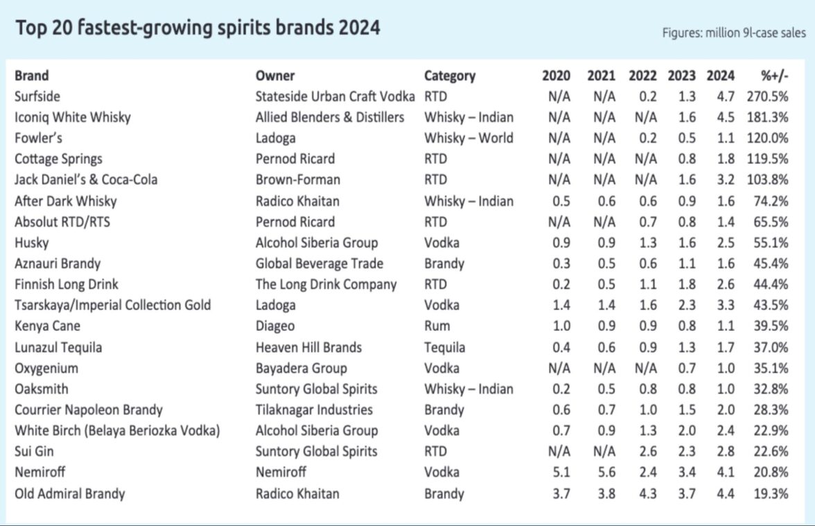 В рейтинге алкогольных брендов, чьи продажи росли в 2024 году быстрее всего, видное место занимают бренды индийского виски и готовых к употреблению напитков. Возглавил рейтинг RTD Surfside производства компании Stateside Urbancraft Vodka из Филадельфии. Продажи этого коктейля выросли за год на 270,5% — с 1,3 млн до 4,7 млн ящиков. Рост на 181,3% продемонстрировал бренд индийского виски Iconiq White Whisky индийской компании Allied Blenders and Distille (ABD). В зависимости от типа маркетинговых материалов этот напиток называется как «премиальным брендом импортных шотландских молтов», так и «новым бюджетными виски». «Бронза» в рейтинге быстрорастущих — у нашего, российского, индийского виски Fowler’s компании «Ладога» — рост на 120%, с 500 тыс. до 1,1 млн ящиков. На 11-й строчке рейтинга — еще один продукт от «Ладоги» — водка «Царская. Императорская коллекция». Восьмое место — у водки «Хаски», которую производит «Алкогольная Сибирская Группа». Водка «Белая березка» того же производителя занимает 17-ю строчку рейтинга.