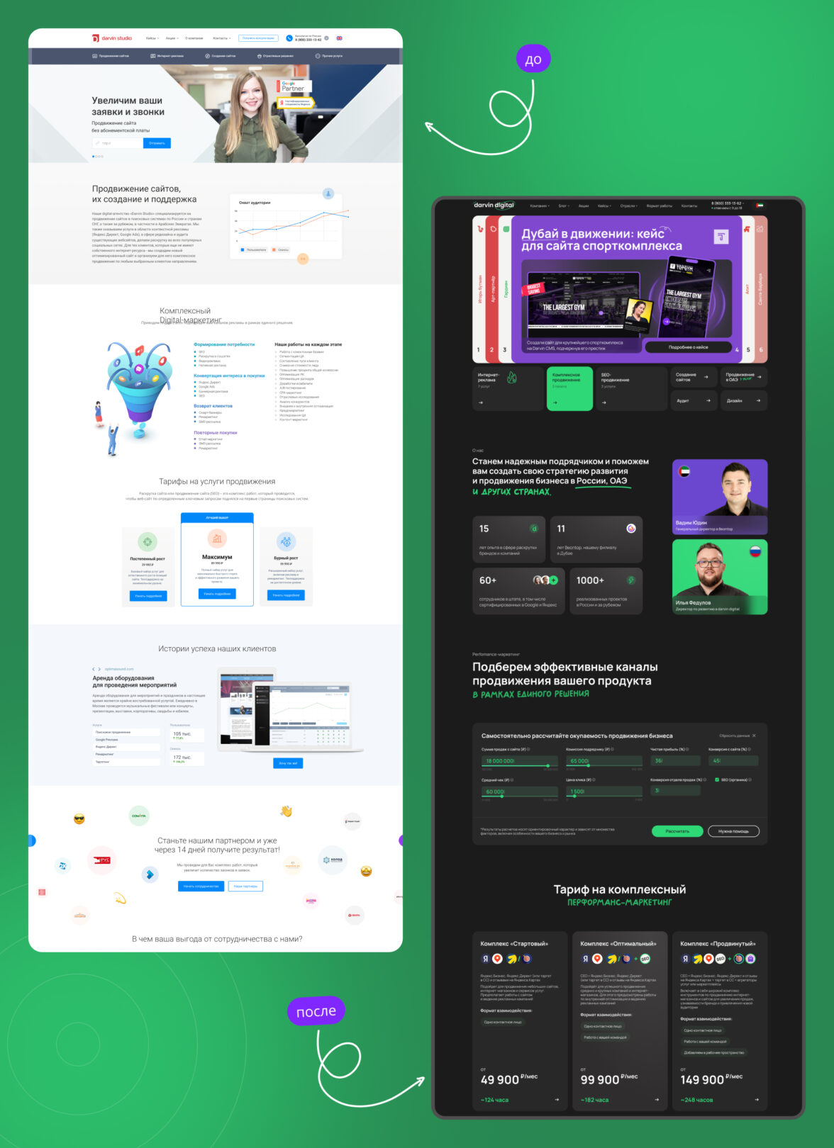 До 2022 года агентство называлось иначе — Darvin Studio. Был другим и наш сайт: выглядел как типичное агентство из нулевых. Белый фон, размытые офферы, сложная структура, неактуальные кейсы.