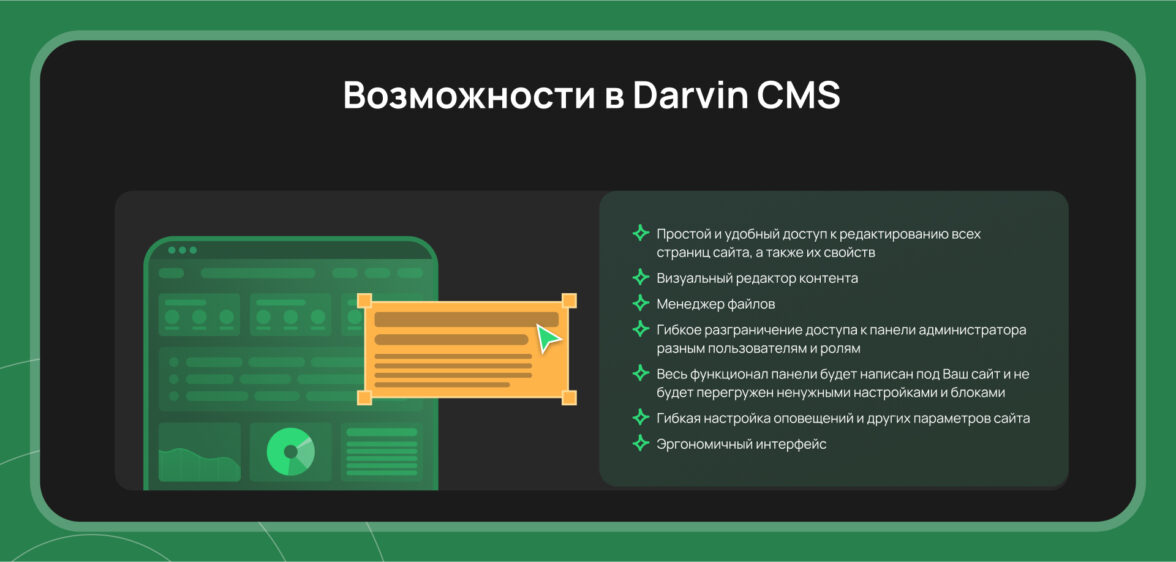Сайт получился удобным не только для пользователя. В Darvin Digital — это рабочий инструмент, с которым постоянно взаимодействует команда: маркетологи, копирайтеры, оптимизаторы. Поэтому уже на этапе разработки мы заложили важные «плюшки» для своих, чтобы после запуска не приходилось лезть в код ради правки блока или добавления новой услуги.