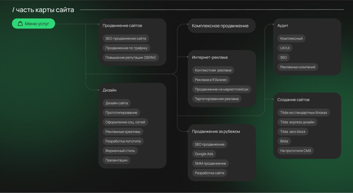 В результате получил каркас сайта без лишнего, где каждая страница решает свою задачу. На этом этапе важно не забывать, что UX — это не про удобные кнопки, а про смысловую навигацию. Люди не читают, они бегло сканируют ваш сайт. И если логика не работает, визуал не спасёт.