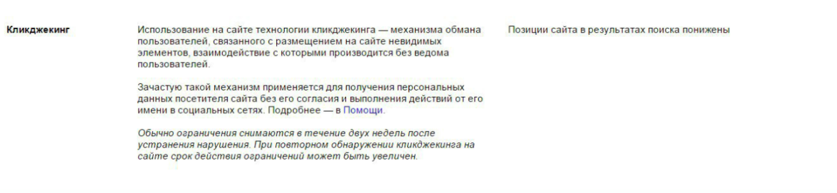 Фильтр за кликджекинг. Кликджекинг — это метод обмана пользователей, основанный на размещении невидимых элементов, покрывающих собой всю страницу или отдельный объект на ней. При клике на такие невидимые элементы происходит выполнение определенного сценария не по воле пользователя. К таким сценариям может относиться манипуляция целевыми действиями и поведенческими метриками, похищение личных данных посетителей и т.п. Фильтр за кликджекинг был введен Яндексом ещё в 2015 году.