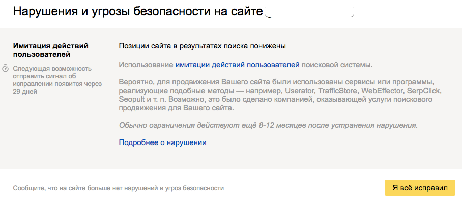 Редко, но бывают случаи ручного наложения санкций. При этом в Яндекс.Вебмастере появится уведомление: