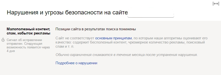 Как выйти: в случае подтверждения со стороны поддержки, необходимо ликвидировать спамные блоки, отправить нужные страницы в «Переобход страниц» и ещё раз написать в поддержку.