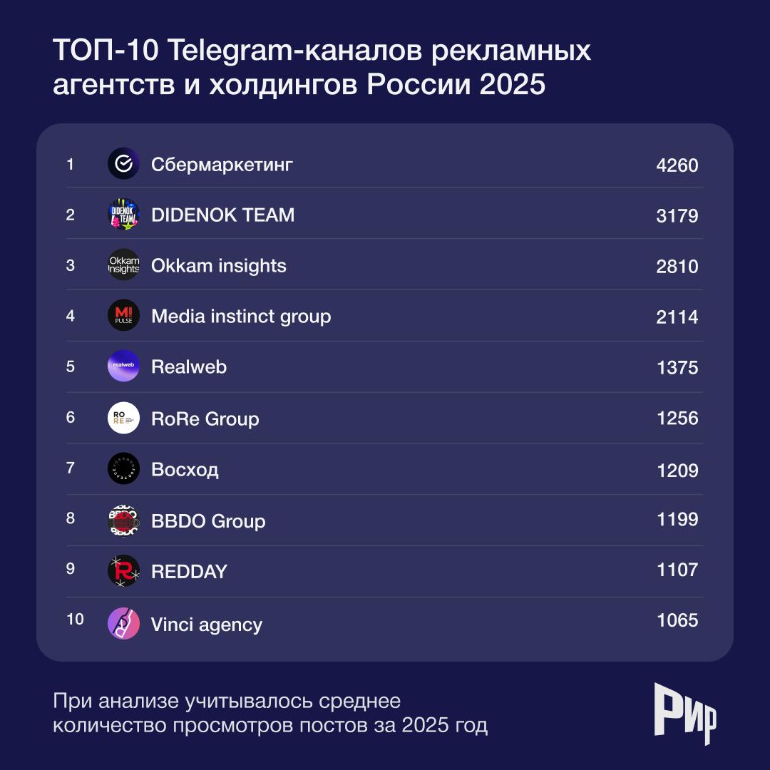 Telegram-канал СберМаркетинга занял первое место в ТОП-10 каналов рекламных агентств и холдингов России по итогам 2025 года. Рейтинг, основанный на среднем количестве просмотров публикаций за год, представил официальный канал ассоциаций АКАР, АРИР и РАМУ — «Рекламная индустрия России».