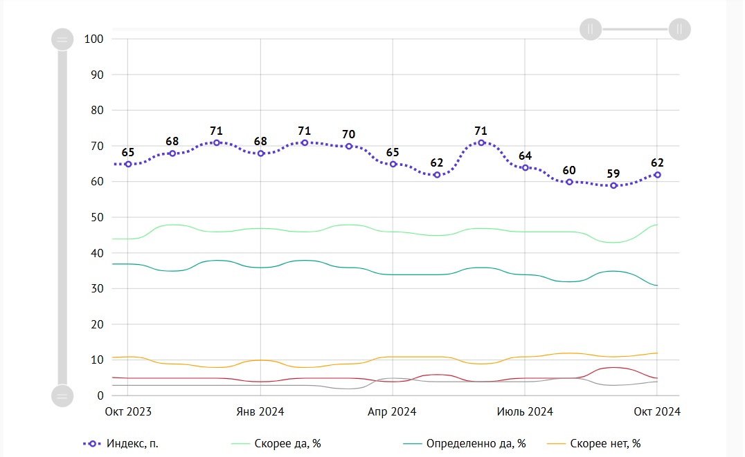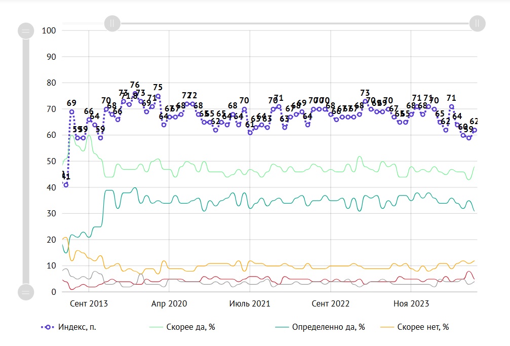 В апреле 2012 года индекс составил 59 пунктов и больше никогда не опускался ниже этой отметки, то есть счастливых россиян всегда было больше, чем несчастливых. Показатель 59 пунктов был также отмечен в апреле 2013 года, ноябре 2014 года и сентябре 2024 года. Самый высокий — 73 пункта — в марте 2023 года.