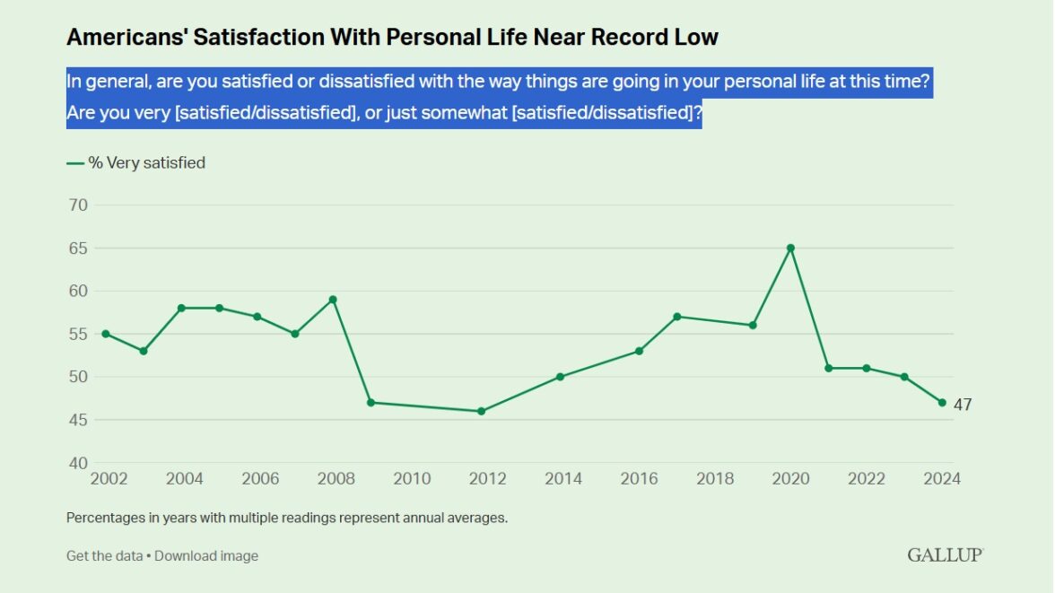 В феврале 2024 года был опубликован результат опроса «Настроение нации», проведенного 2–22 января 2024 года Gallup. Жителям США задавался вопрос: «В целом, вы удовлетворены или не удовлетворены тем, как обстоят дела в вашей личной жизни в настоящее время? Вы очень (удовлетворены/не удовлетворены) или лишь в некоторой степени (удовлетворены/не удовлетворены)?» Положительные ответы дали 78% американцев, в том числе 47% заявили, что они полностью довольны тем, как обстоят дела в их личной жизни. Этот показатель оказался на 3 пункта ниже прошлогоднего. Всего третий раз за период с 2002 года число полностью удовлетворенных жизнью американцев оказалось ниже 50. В кризисном 2008 году их было столько же, сколько в 2024 году, а самый низкий показатель — 46 — был отмечен в 2011 году.