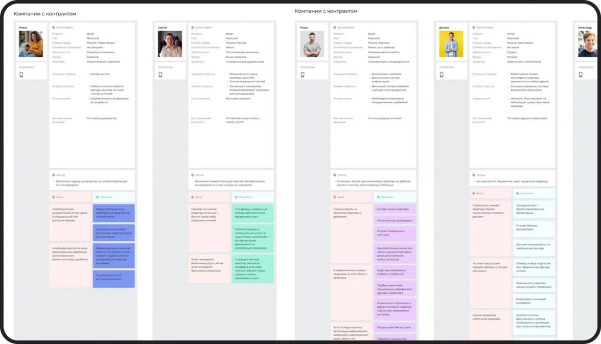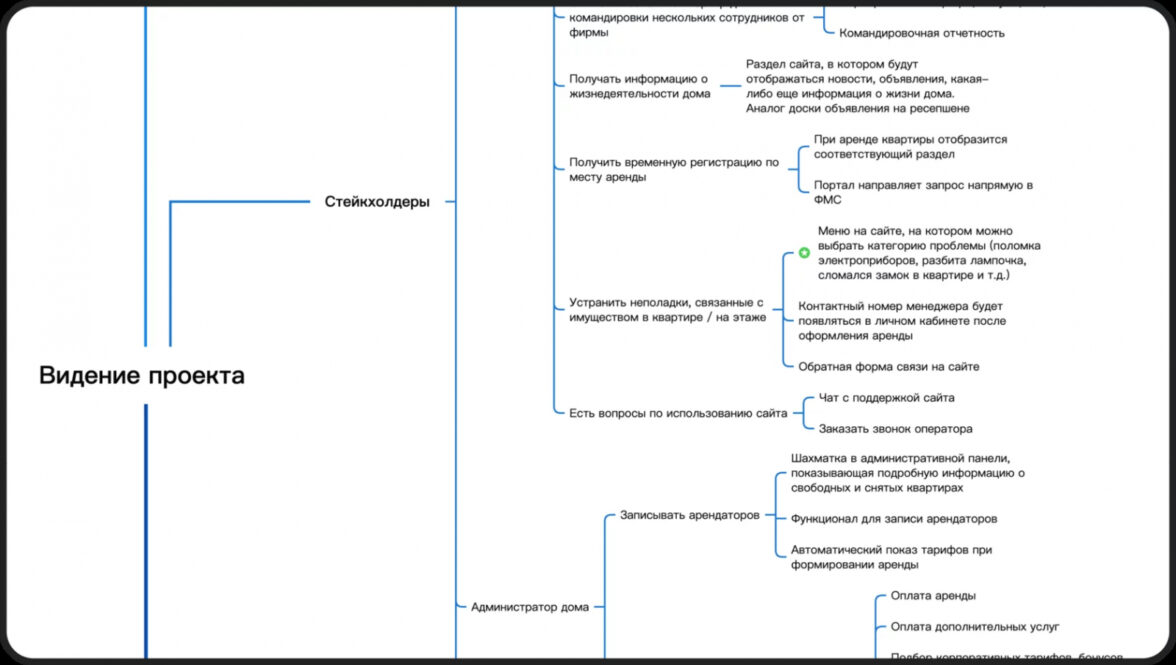Составили видение проекта. Анализируя стейкхолдеров (всех заинтересованных в проекте людей), мы выявили их самые злободневные боли. У клиента болело одно, у арендаторов — второе, у администратора сайта — третье. Посмотрите сами.