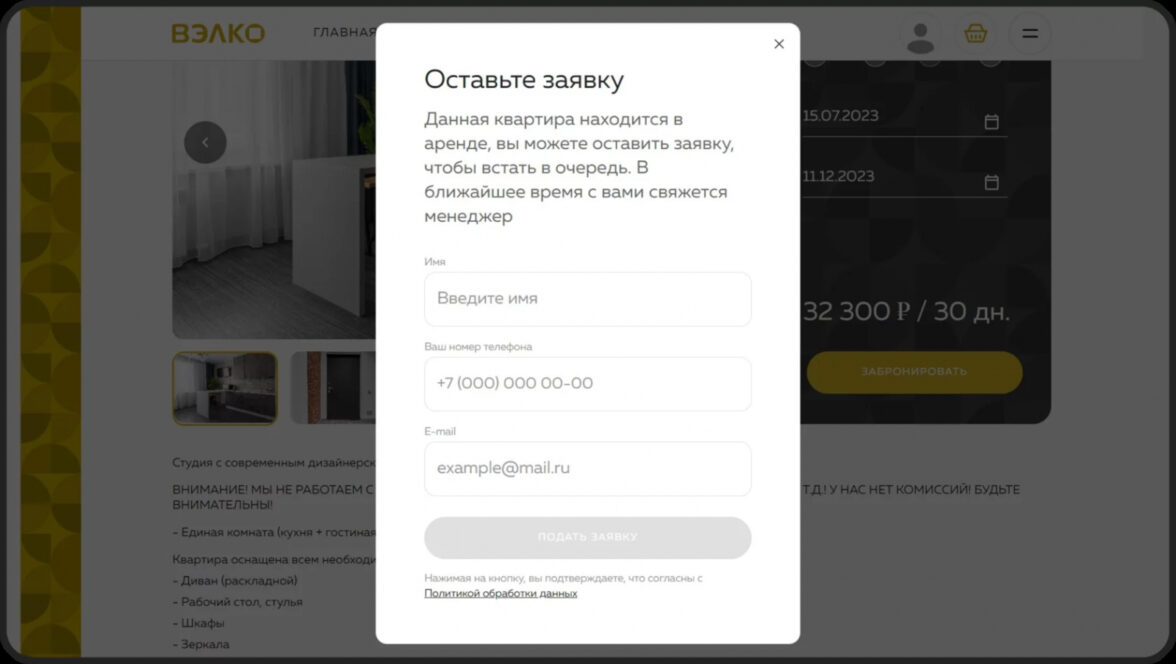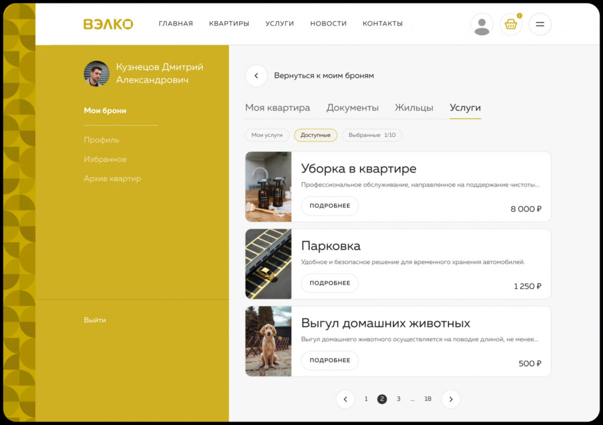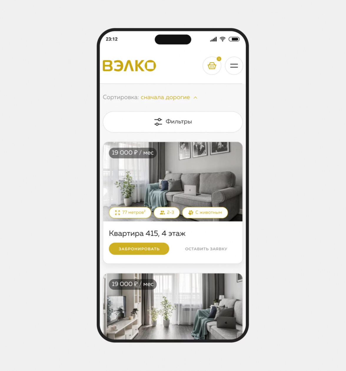 Проанализировали конкурентов и разработали структуру, по которой будет делаться прототип. Главными стали Авито, Airbnb, ЦИАН, Домофонд, Юла и Booking. Посмотрели, что они предлагают, проанализировали сайты, структуру, навигацию, оформление. Подглядели фишки и придумали свои. Например, реферальную программу, подбор похожих предложений, доску объявлений и удобную форму оплаты, в которой цена считается сразу за весь срок аренды. Но самой главной особенностью стала сама идея того, что у «Вэлко» сдается весь 17-этажный дом.