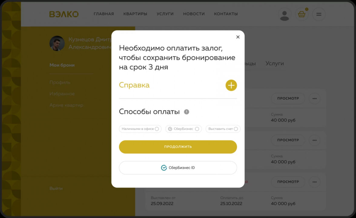 С платежными системами. С «ЮКассой» и «СберБизнесом», потому что арендовать квартиру могут и физические лица, и юридические. Изначально планировалась только СберОплата b2c. Но когда с нашей стороны было почти все готово, клиент попросил переехать на ЮКассу, так как первый вариант стал для них неактуален. Благо, что SCRUM, по которому мы работаем, позволяет внедрять что-то новое уже в процессе. B2b оплату мы сделали через СберБизнес.