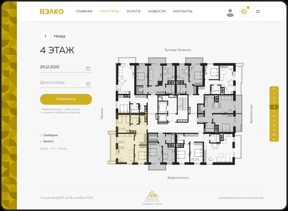 Фишка дизайна — интерактивная модель многоэтажки. По клику можно увидеть, что находится на территории и посмотреть свободные квартиры.