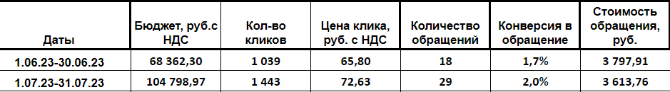Сделали и получили в первый месяц 18 лидов, где стоимость одного была 3 800 р. В следующий месяц лиды выросли до 29, а их стоимость уменьшилась до 3 600 р.
