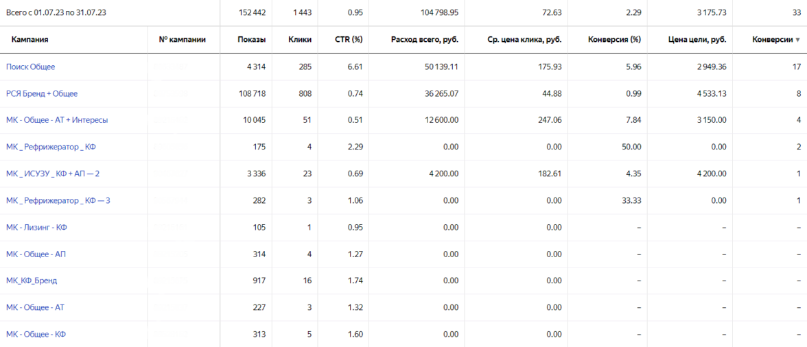 Часть рекламных кампаний, которые были запущены в первый месяц работы