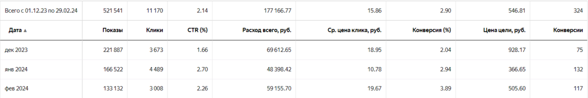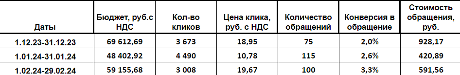 С новым сайтом и доменом мы вышли на всю Россию. Бюджет в 100 000 р был не нужен. Мы обходились меньшими затратами, и при этом приносили более весомый результат. Цена упала в 3 раза, а количество заявок росло. Например, стоимость обращения уже в феврале 2024 года составила почти 600 р.