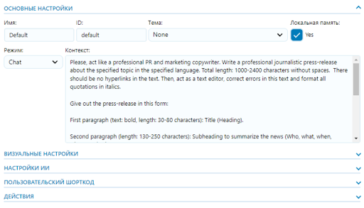 Начали создание «промпта» с уже классической фразы «act like a…» и протестировали разные комбинации ключевых слов, чтобы узнать, как заставить ИИ лучше понимать требования к типовым пресс-релизам и при этом гибко подстраивать результат под заданную пользователем информацию, а не выдавать одинаковые тексты на каждый запрос. В нашем случае, полный текст запроса получился длиной в 1200 символов.