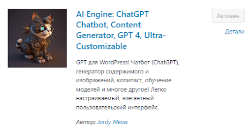 Но, раз мы используем одну из самых популярных CMS, решили для начала поискать готовые решения для Wordpress и не ошиблись. Опробовав пару подходящих плагинов, остановились на AI Engine разработки Jordy Meow.