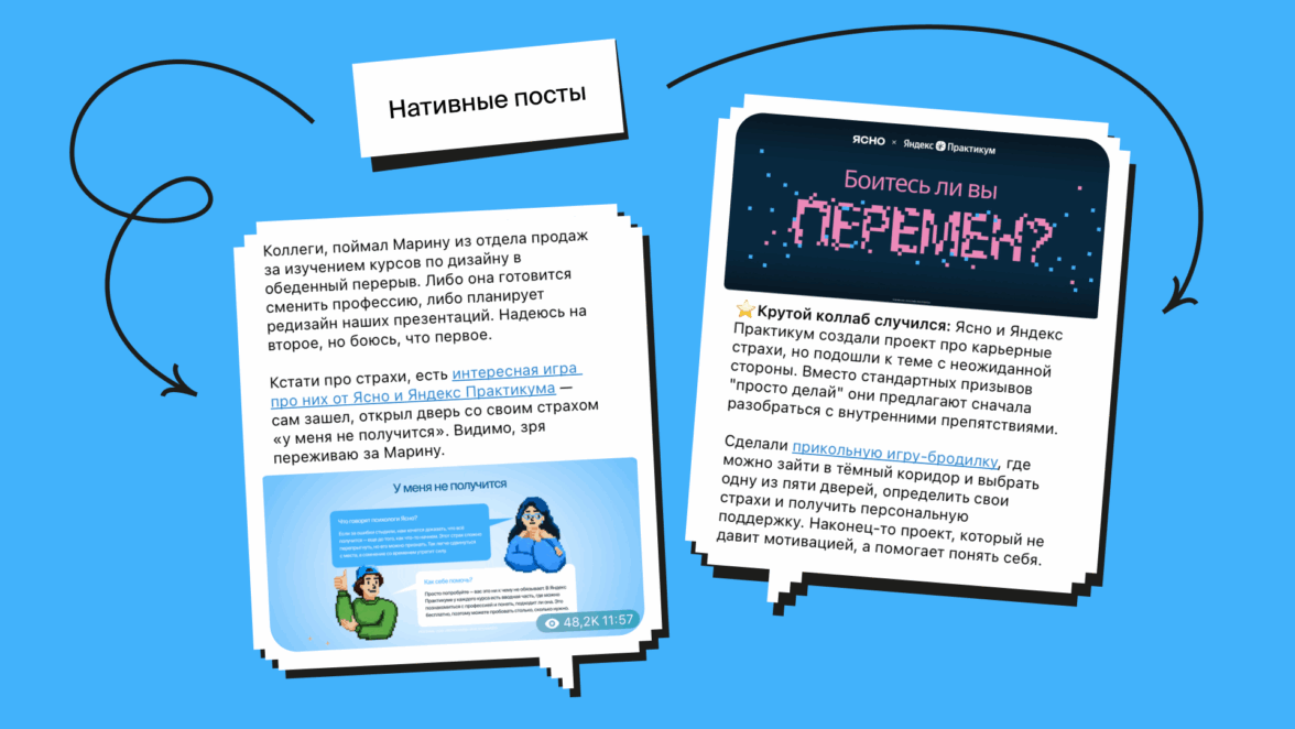 Опыт с двумя кампаниями для Ясно показал, что посевы в Telegram нужно адаптировать под аудиторию конкретного канала. Пост, который органично смотрится в личном блоге, не подойдёт для новостного или тематического формата. Мы кастомизировали каждую интеграцию: вручную подбирали тон, визуалы и текст под стиль автора: всё это дало нужные результаты.