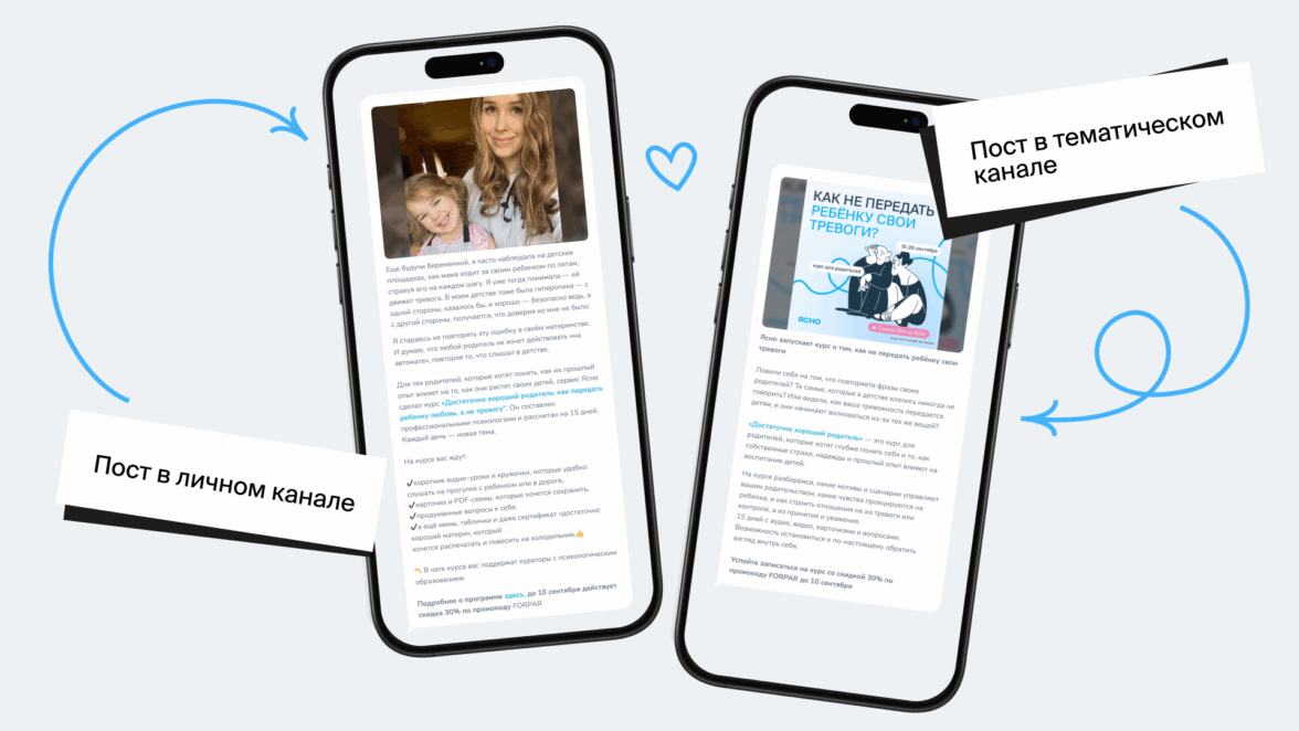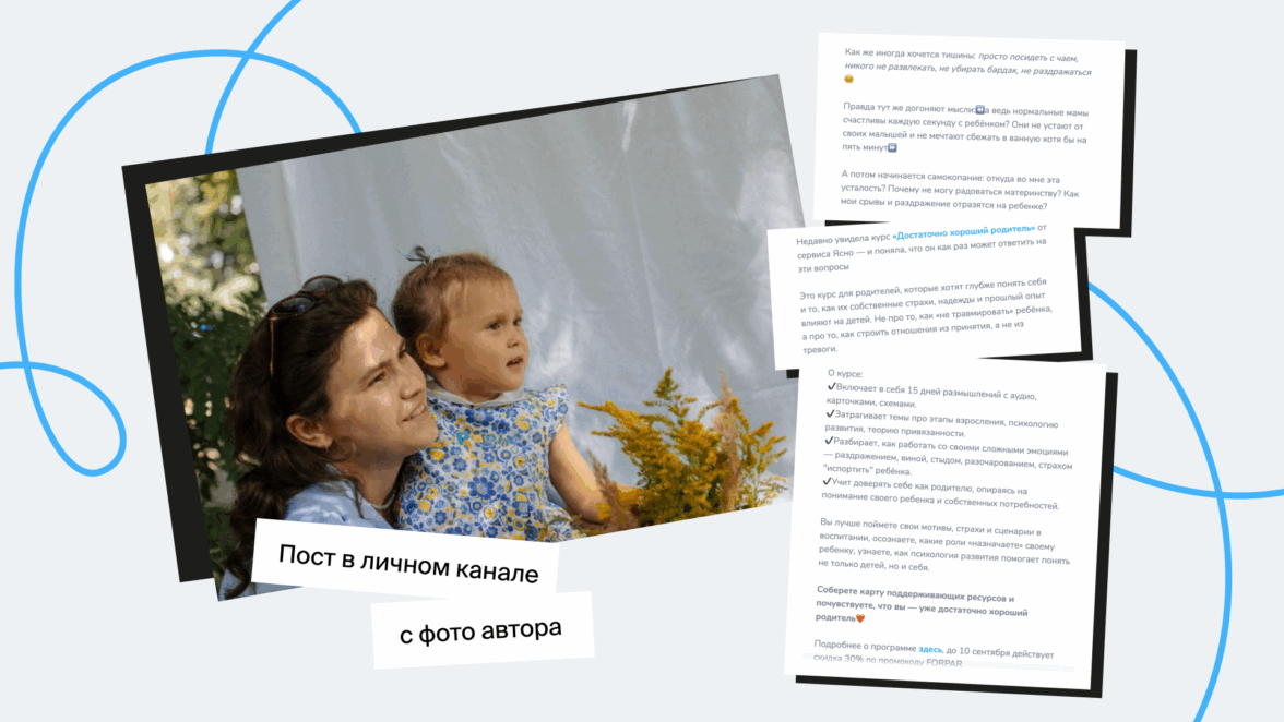 Для личных каналов написали нативный текст в стиле блогера. А чтобы усилить доверие, использовали личное фото автора с его ребенком.