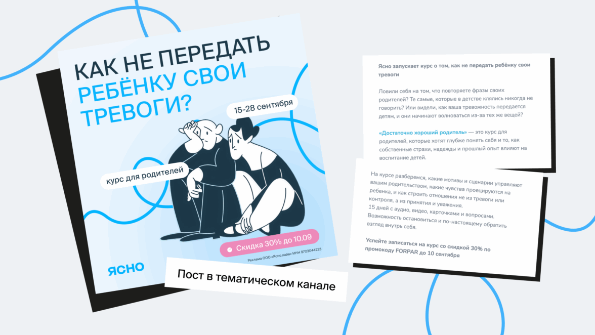 Второй наш проект с посевами в телеграм-каналах для Ясно — реклама продукта «Достаточно хороший родитель». Это курс для родителей, которые хотят разобраться, как их собственные страхи, надежды и прошлый опыт влияют на отношения с детьми.