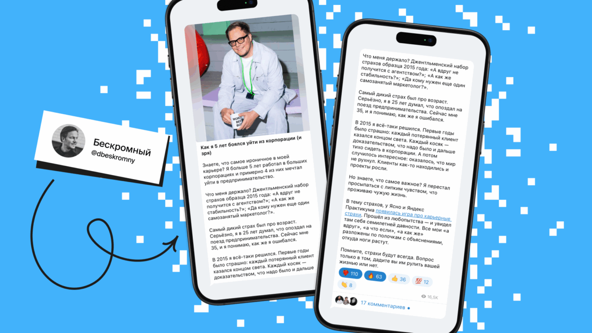 Интеграции с блогерами сделали максимально нативными и подкрепили тему реальными историями. Например, автор канала «Бескромный» поделился, как пять лет боялся уйти из корпорации на фриланс из-за страха, что ничего не получится. Аудитория это оценила. Люди писали в комментариях, что блогер затронул больную тему.