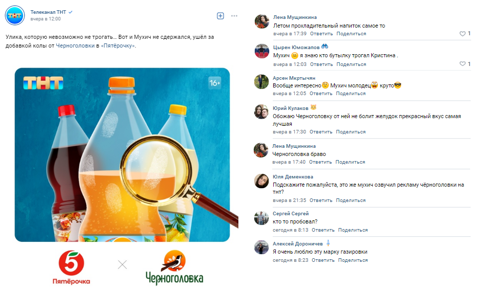 В официальном сообществе телеканала ТНТ во «ВКонтакте» (с аудиторией более 5,9 млн подписчиков) еженедельно выходят посты, связанные с детективной деятельностью Мухича и продукцией брендов. В магазинах «Пятерочка» была запущена аудиореклама – кросс-промоушн решение, которое одновременно продвигает спецпроект «Пятерочки» и сериал «Детективное агентство Мухича».