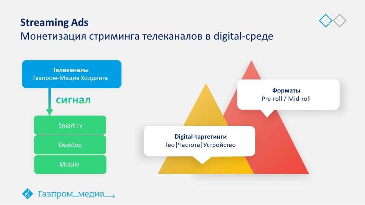Сейлз-хаус «Газпром-Медиа» регулярно отслеживает, куда мигрирует аудитория, и разрабатывает рекламные решения в зонах ее прироста. Продукт Streaming Ads сформирован на интересе зрителей к линейному ТВ-потреблению в цифровой среде. Одновременно с этим он отвечает высокому спросу рекламодателей на премиальный brand safe контент и предоставляет возможности digital-инвентаря: измерение, таргетинг, верификация и управление частотой.