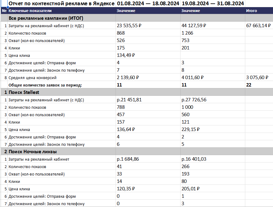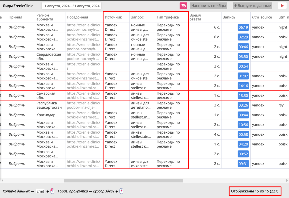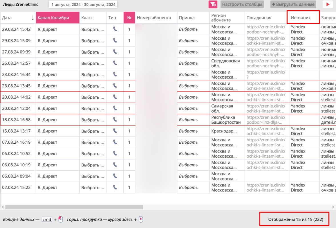 • Конверсии со звонков: в августе 15 из 22 заявок поступили через звонки.