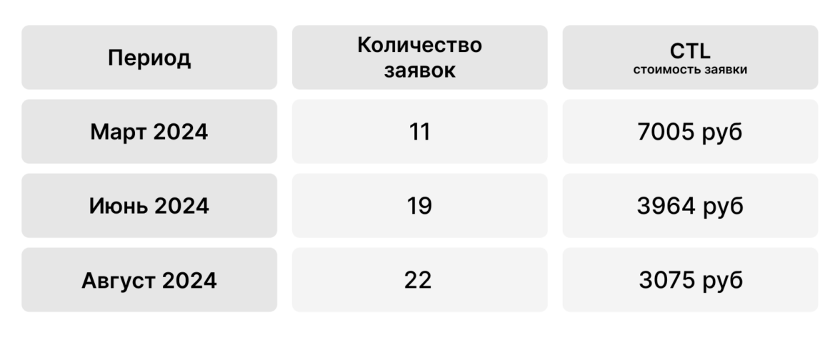 • Высокая стоимость заявки (CPL) на старте. В первые месяцы цена заявки достигала 7006 рублей, что делало рекламу малоэффективной.