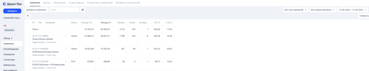 Статистика в разрезе рекламных кампаний из кабинета Я.Директ