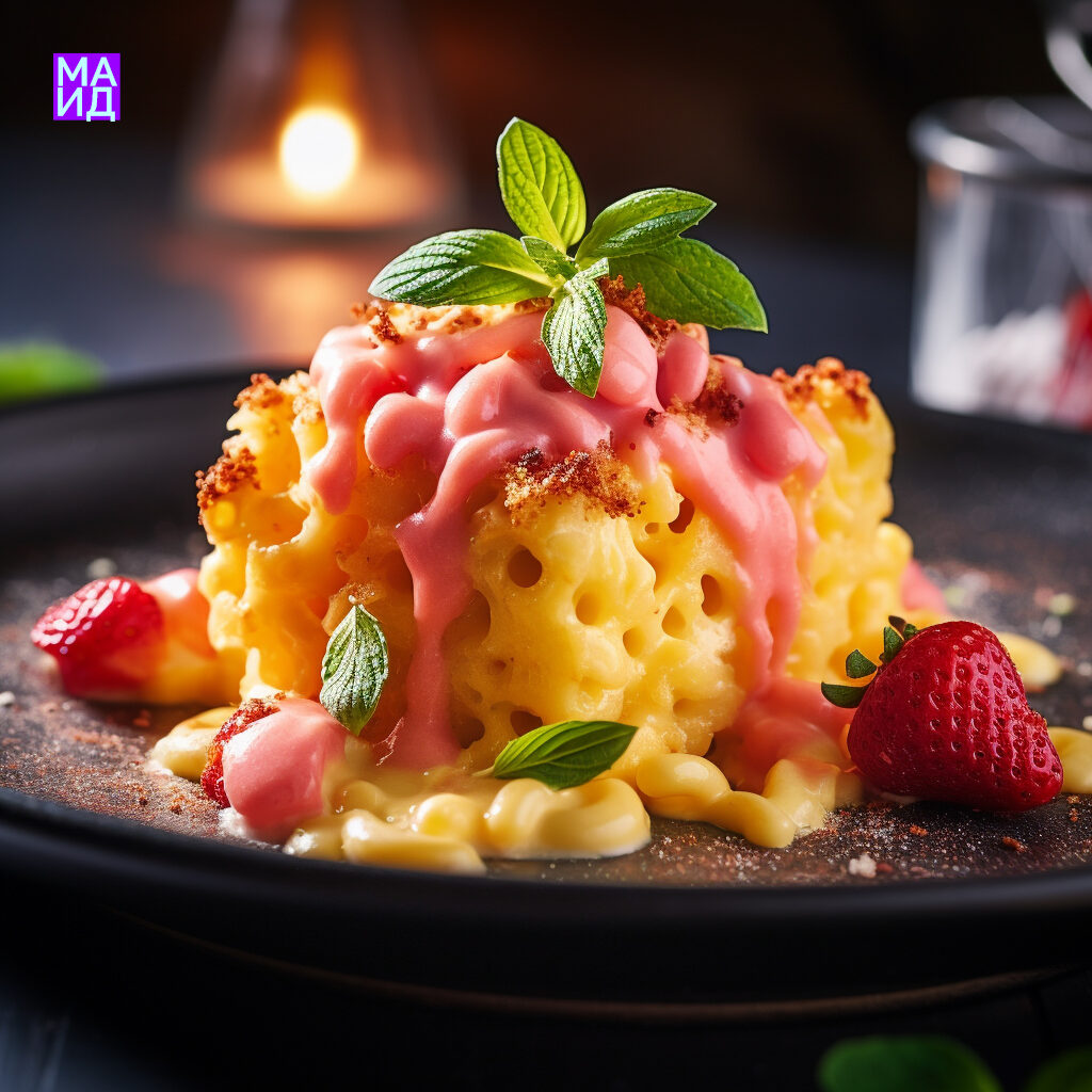 Промпт: Close up view of hot mac and cheese with melted cheese on top next to refreshing strawberry sorbet, food styling, shallow depth of field, shot on Sony A7R IV with macro lens, soft diffused lighting, by Gordon Ramsay.