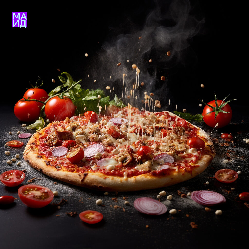 Промпт: Pizzas in motion, food photography, studio.