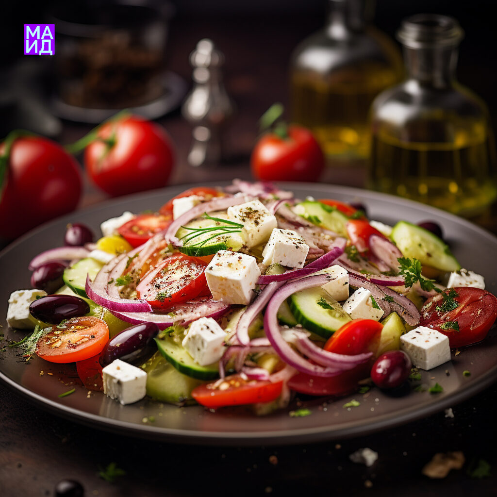 Промпт: Professional food photography, Greek salad with ripe tomatoes, cucumbers, kalamata olives, red onions, and crumbled feta cheese, drizzled with olive oil and oregano.